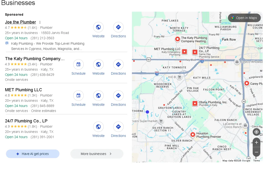 Google Search Map Pack: Google picks the top 3 based on 1) number of reviews, 2) overall score, 3) number of times the owner has responded to a review, and 4) how complete your Google Business Profile is. We can help with all of those.